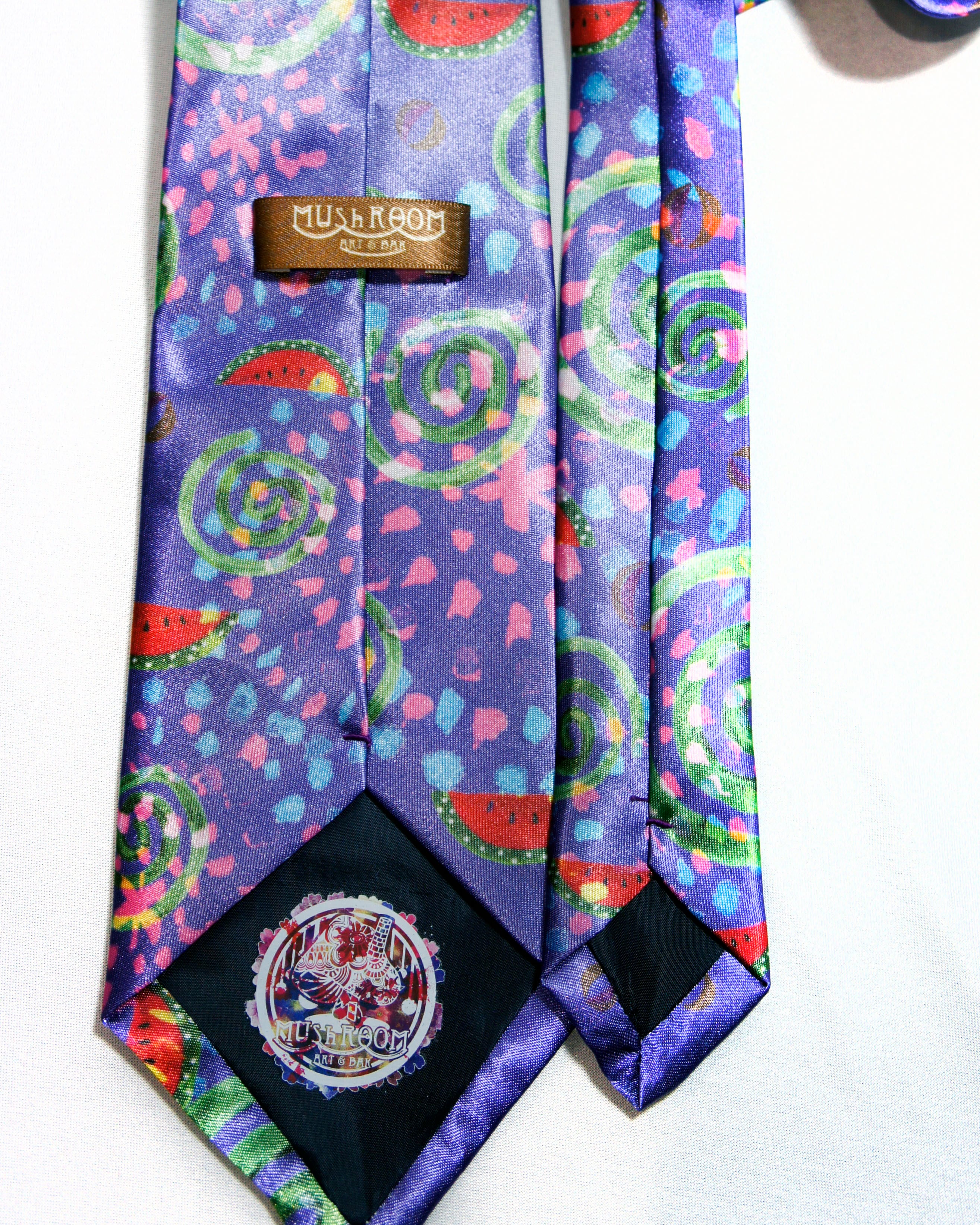 mushroomで生地からすべてデザインし、柄、幅、生地すべて違うデザインの物をご用意しました。生地は輝きのあるサテン生地からマットな綿100%を使用したものまで様々なネクタイをご用意しております。