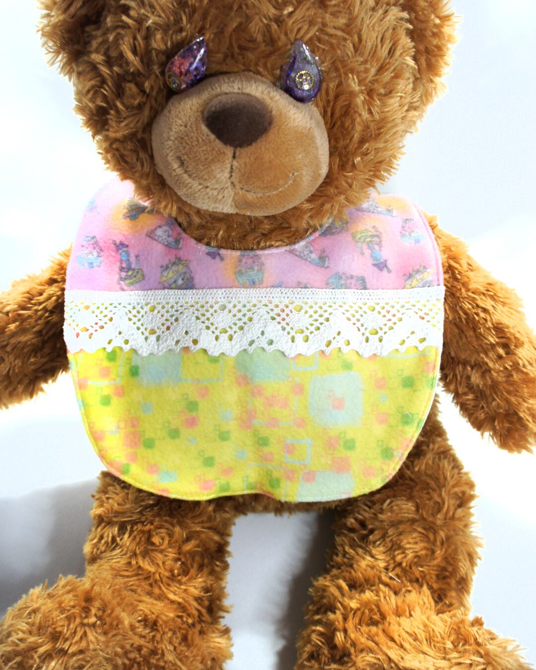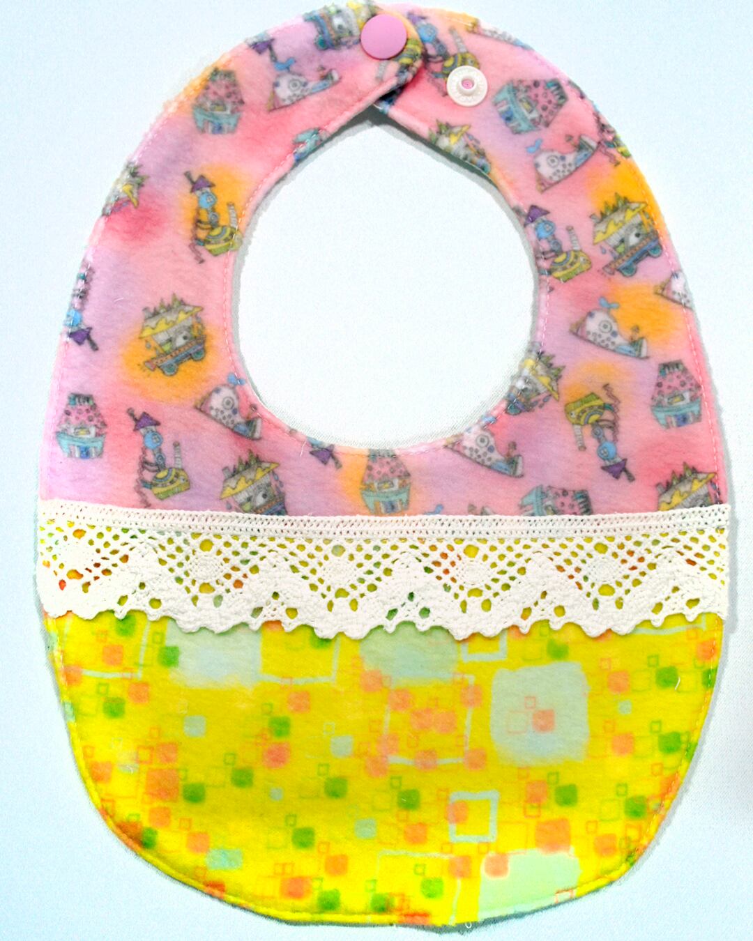 mushroomベビースタイ【よだれかけ】【リバーシブル】【一点物】【レース2ピンクイエロー】