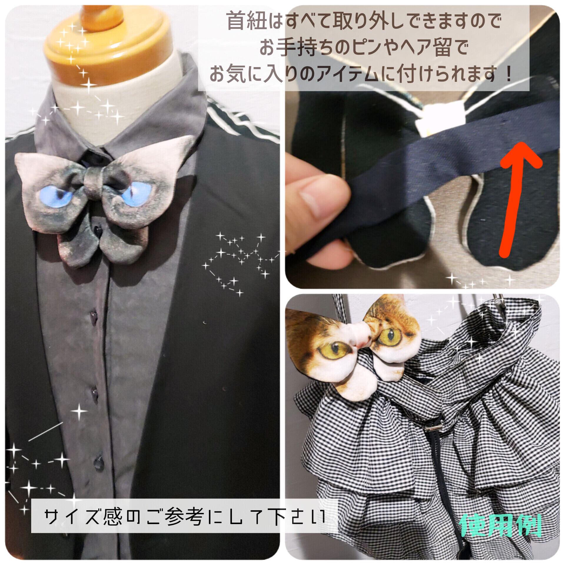 猫のお顔デザインの大ぶり蝶ネクタイ。目力溢れるかわいい猫ちゃん。