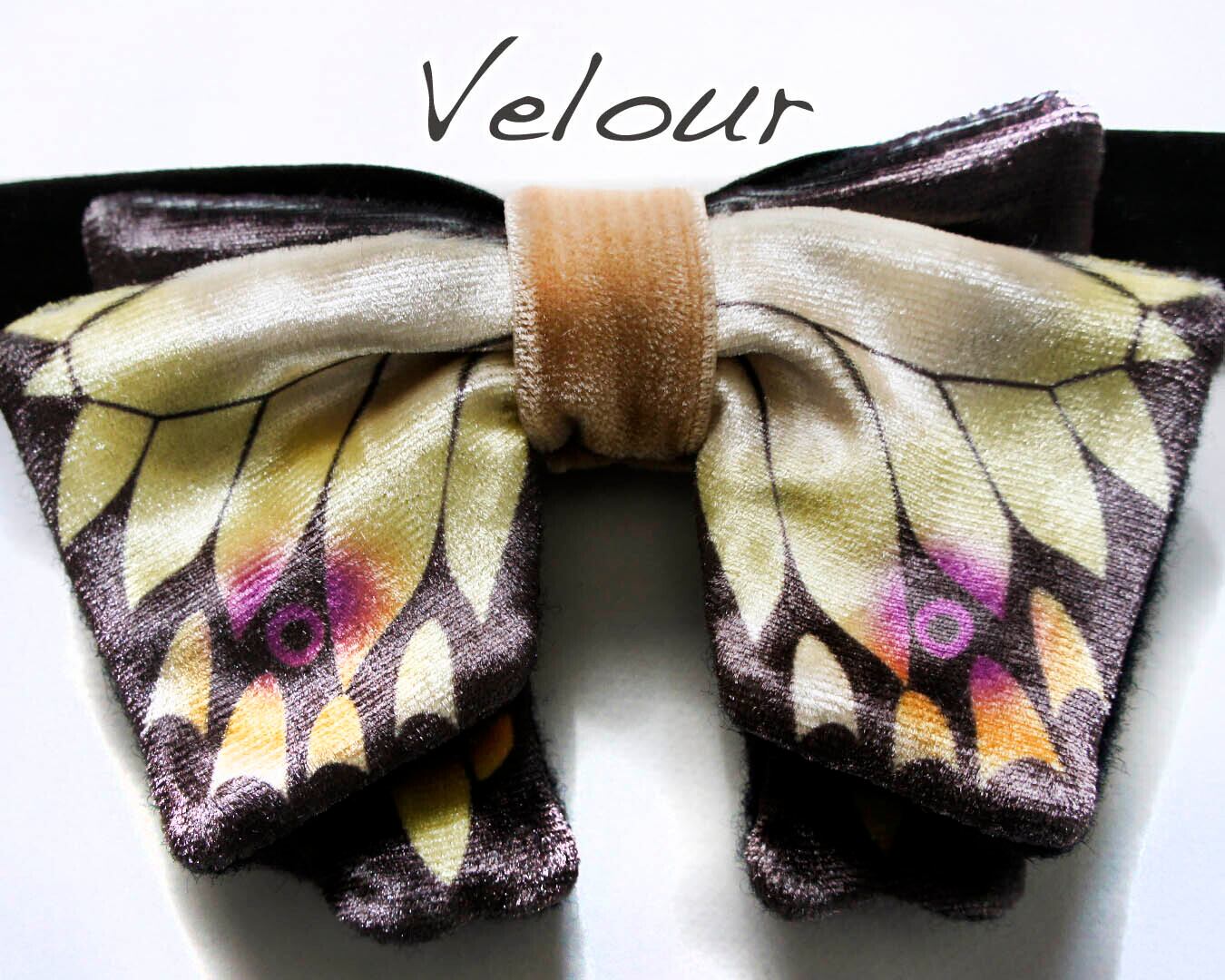 ☆アゲハ蝶ネクタイ ベロアシシーズ⇒ボリュームがありキラキラとした輝きのある生地です。着用するとぽてっとリボンを結んだ様に下向きに仕上がります。