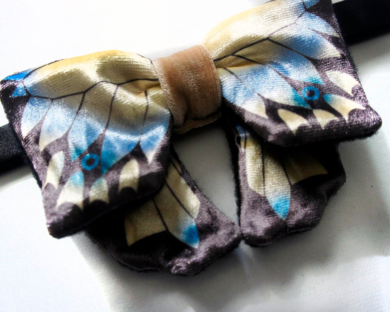 mushroomで生地からすべてデザインし、柄、幅、生地すべて違うデザインの物をご用意しました。あなただけの世界で一本のアゲハ蝶ネクタイをお探しください。