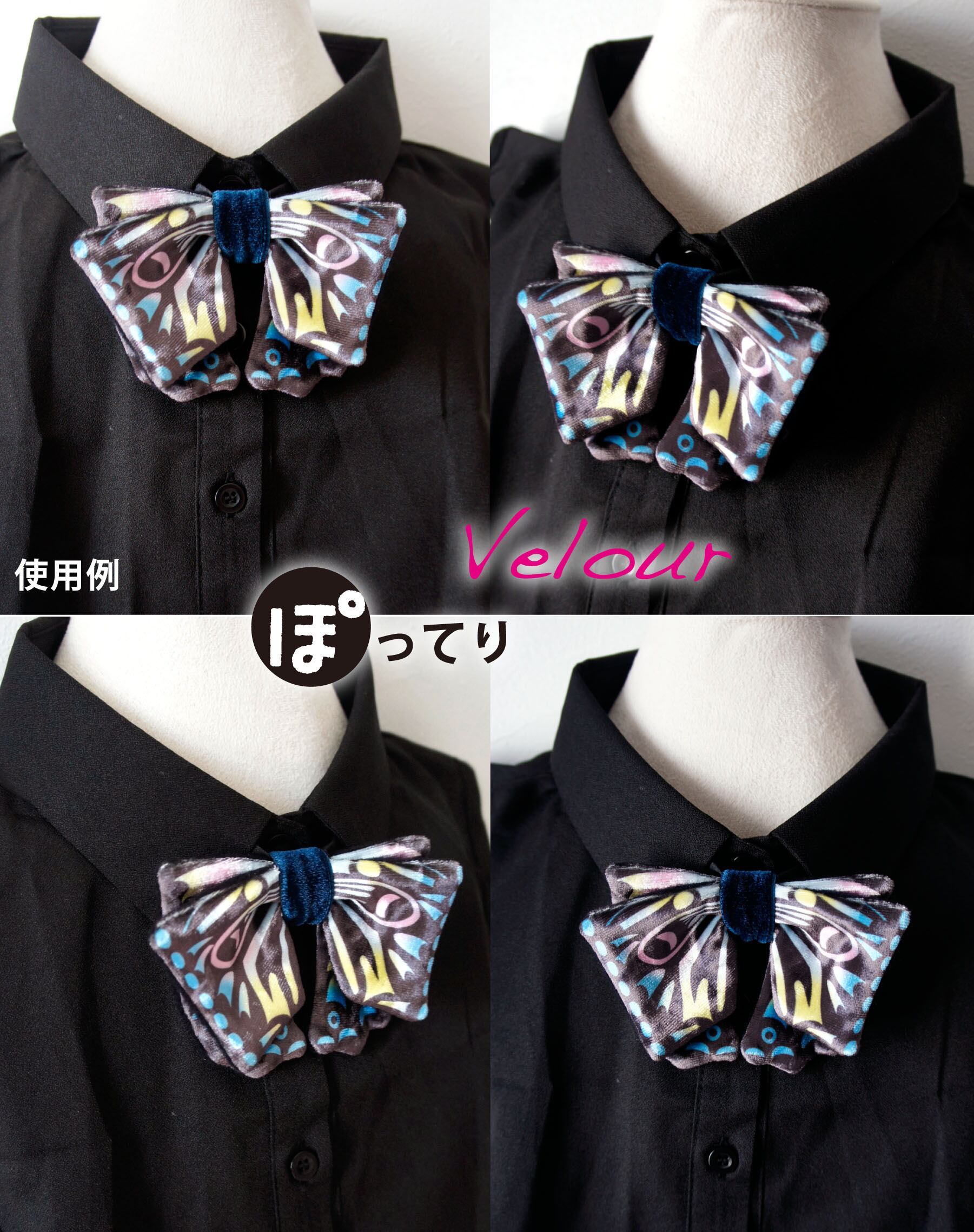 ☆アゲハ蝶ネクタイ ベロアシシーズ⇒ボリュームがありキラキラとした輝きのある生地です。着用するとぽてっとリボンを結んだ様に下向きに仕上がります。