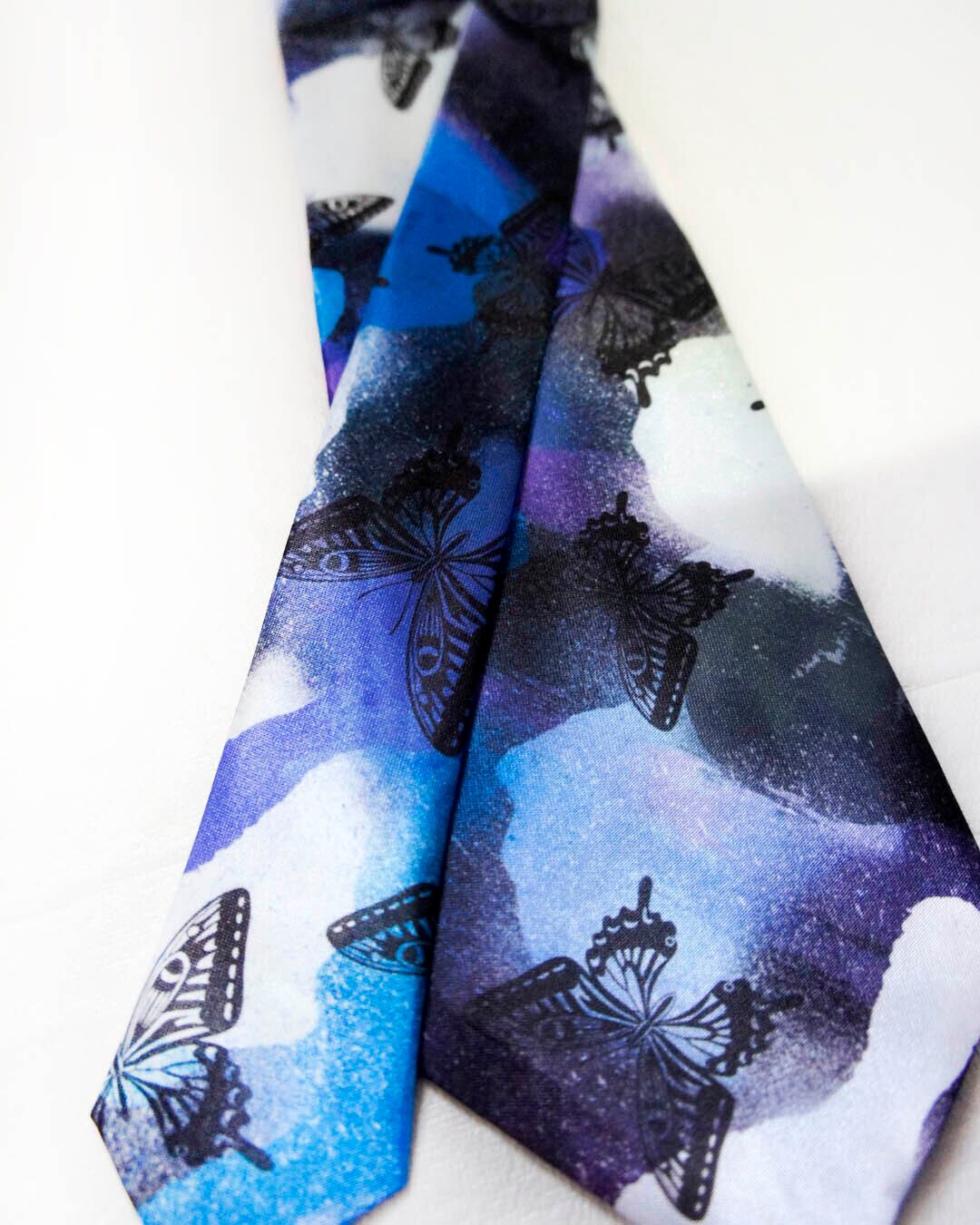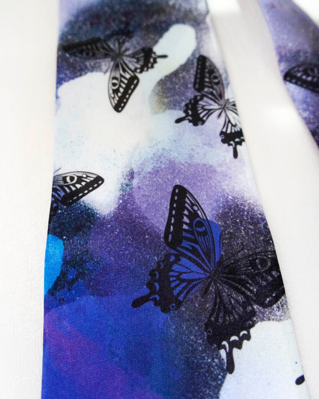 ブルーブラックベースの個性派アゲハ蝶柄デザインのネクタイ。