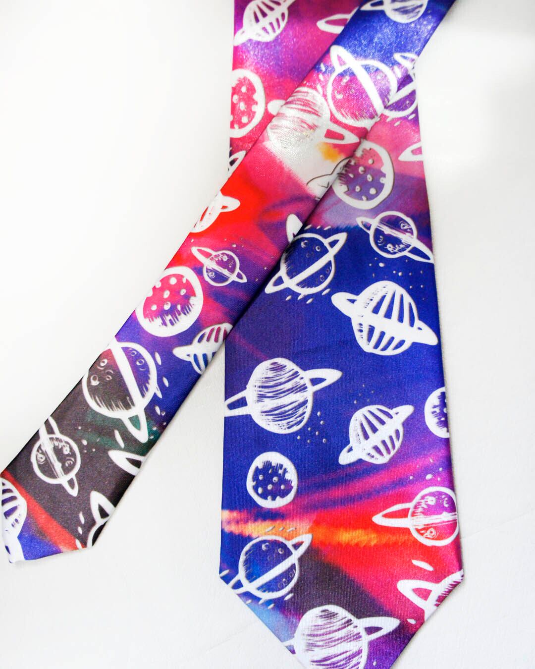 ピンクブルーベースの個性派宇宙柄デザインのネクタイ。